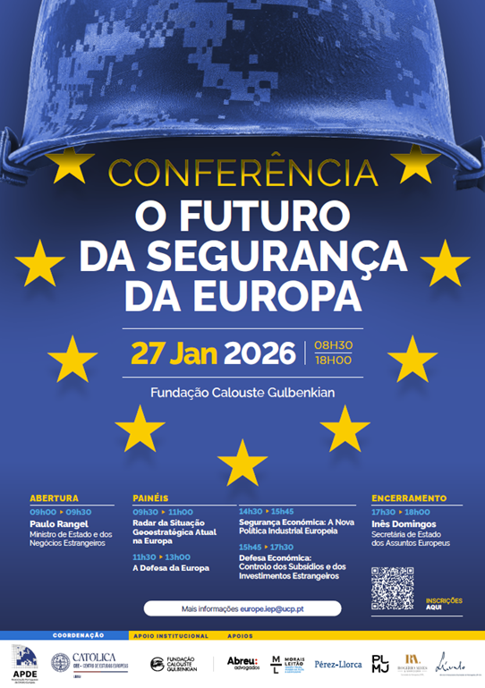 A Conferência “O Futuro da Segurança da Europa”, coorganizada pela Associação Portuguesa de Direito Europeu (APDE) e pelo Centro de Estudos Europeus do Instituto de Estudos Políticos da Universidade Católica Portuguesa, convida, no próximo dia 27 de janeiro, entre as 8h30 e as 18h, à reflexão sobre os principais desafios estratégicos, políticos e económicos da União Europeia num contexto internacional em rápida transformação.